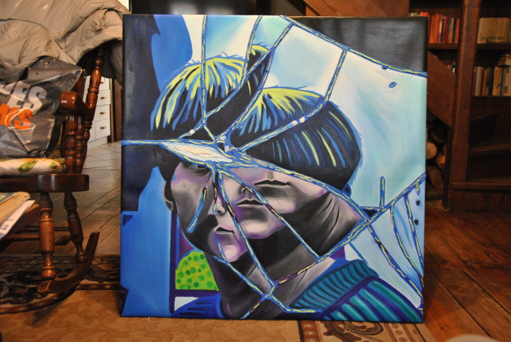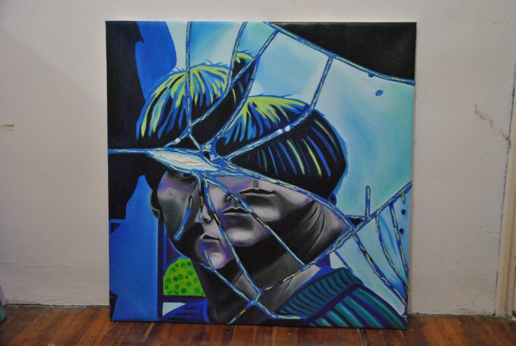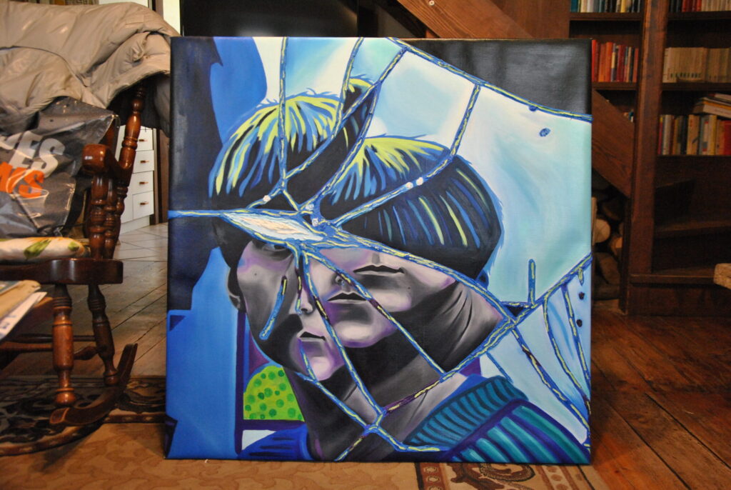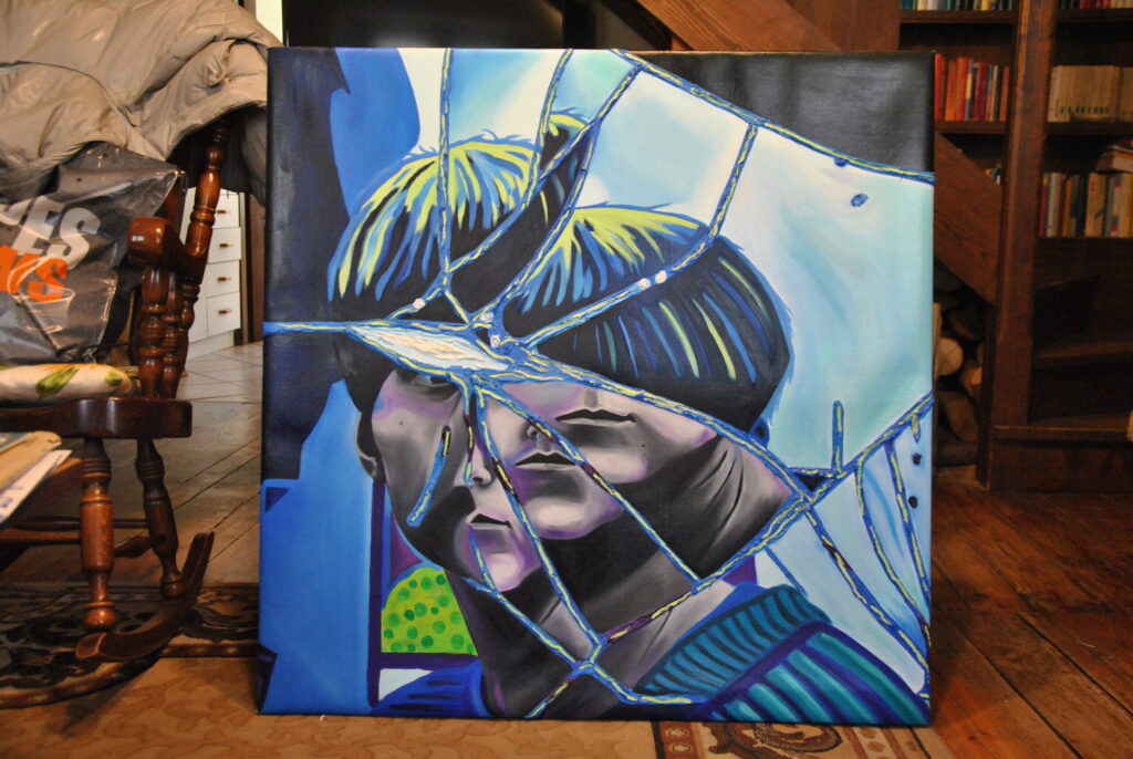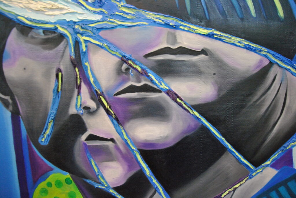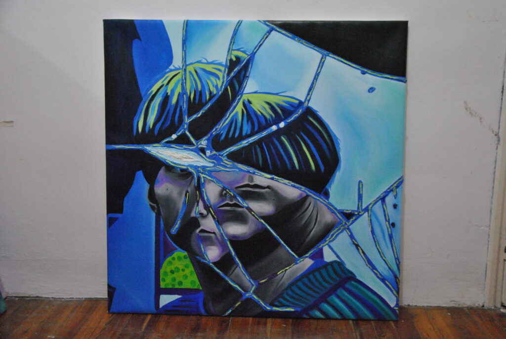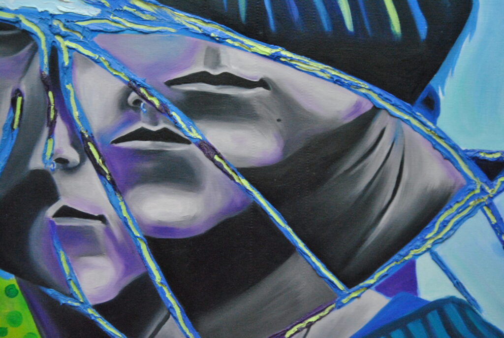Per realizzare la foto di riferimento ho fatto un lavoro di arte terapia, ho preso uno specchio e l’ho rotto con un martello sfogando la rabbia e dopo l’ho pazientemente ricomposto pezzo per pezzo con la colla a caldo. Dopo aver ricreato lo specchio rotto, ho fatto gli scatti fotografici ed infine ho editato i colori dello scatto scelto su Photoshop. La frammentazione che si crea, permette all’individuo che si sta specchiando di vedersi spezzato e ricomposto in maniera casuale ed inusuale.