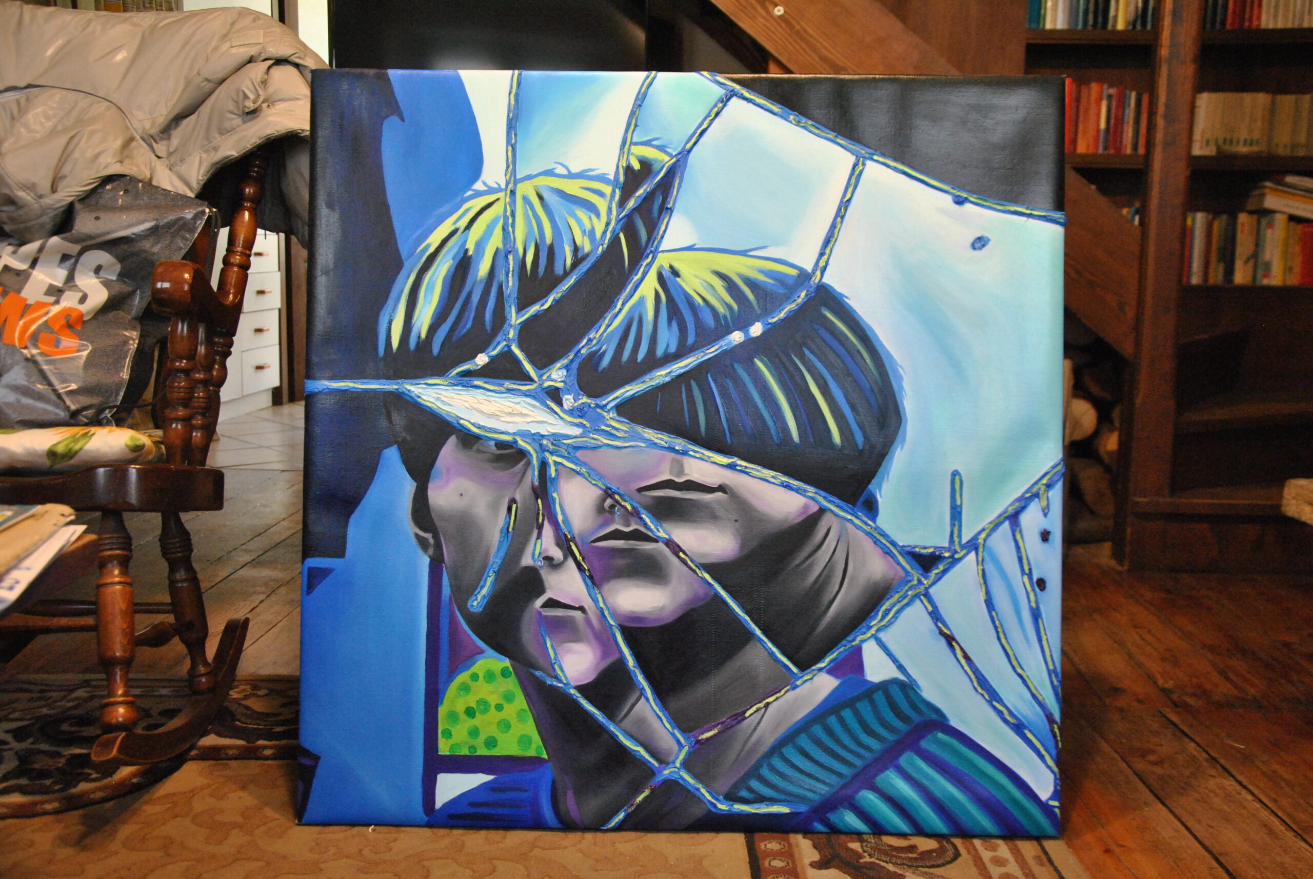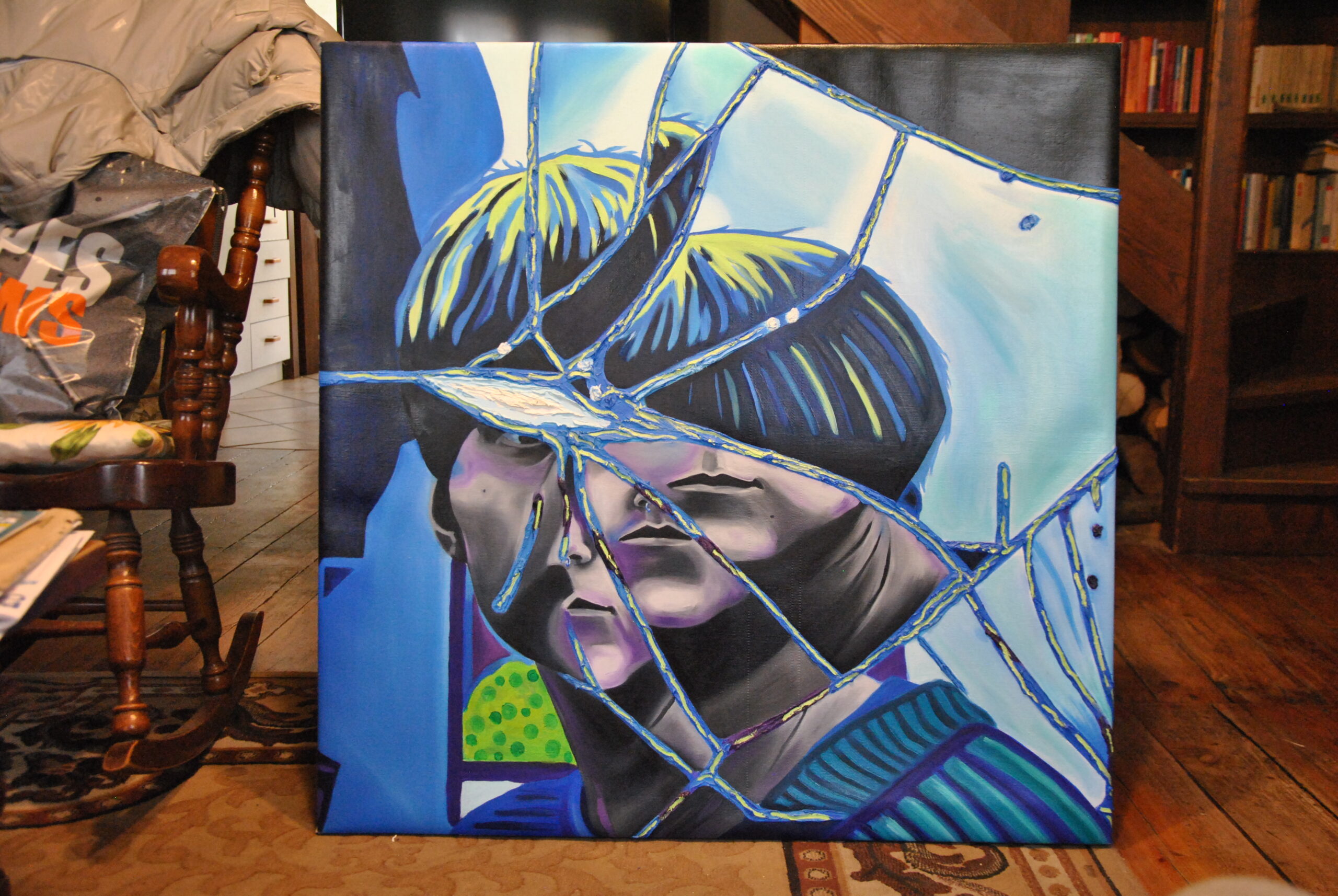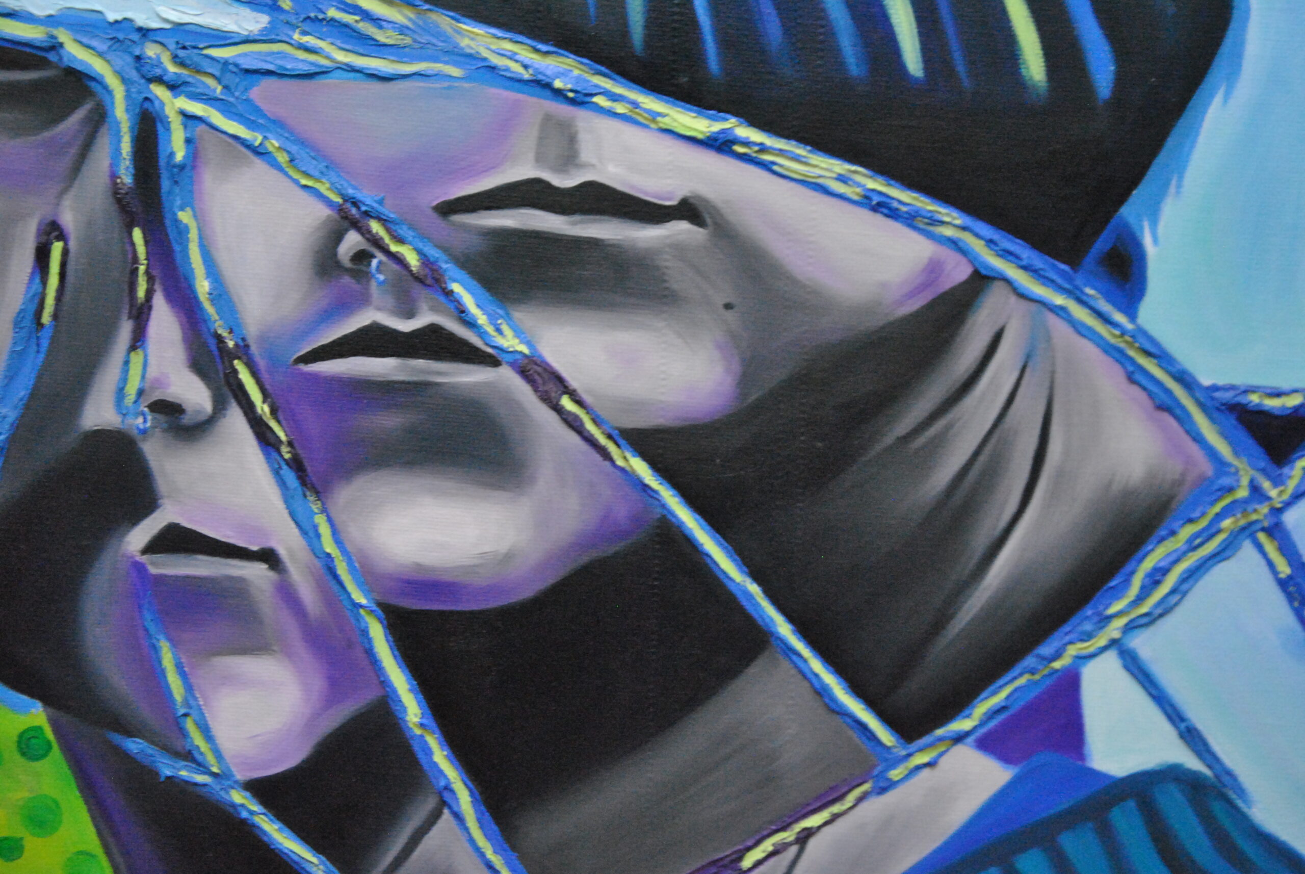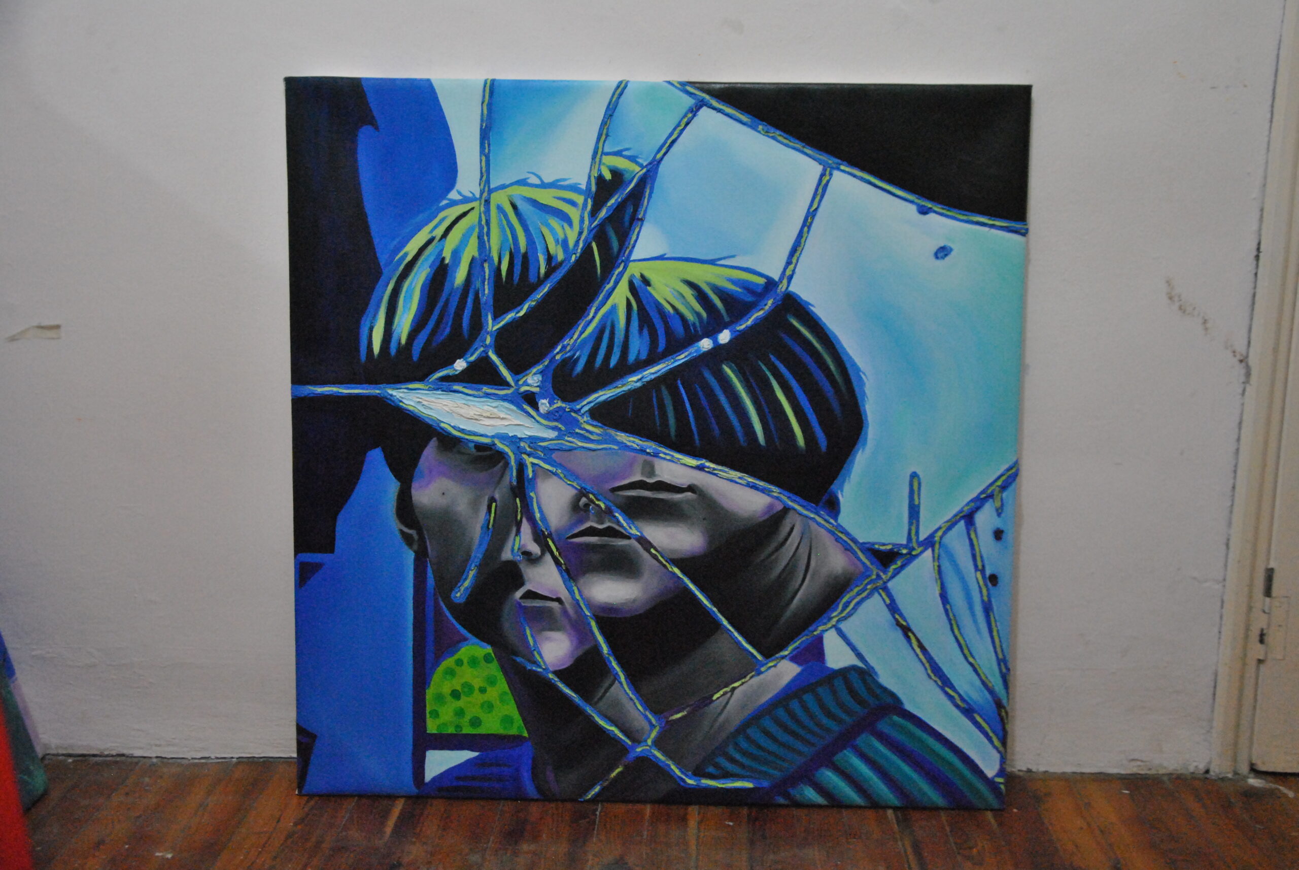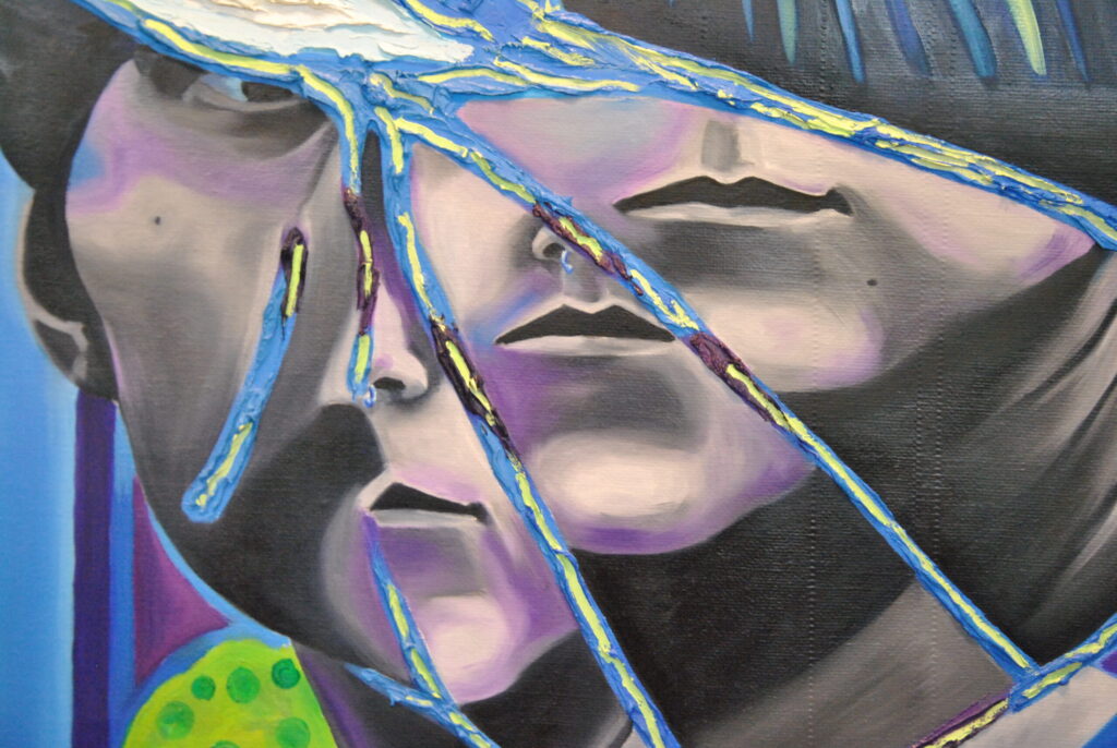 Per realizzare la foto di riferimento ho fatto un lavoro di arte terapia, ho preso uno specchio e l’ho rotto con un martello sfogando la rabbia e dopo l’ho pazientemente ricomposto pezzo per pezzo con la colla a caldo. Dopo aver ricreato lo specchio rotto, ho fatto gli scatti fotografici ed infine ho editato i colori dello scatto scelto su Photoshop. La frammentazione che si crea, permette all’individuo che si sta specchiando di vedersi spezzato e ricomposto in maniera casuale ed inusuale.